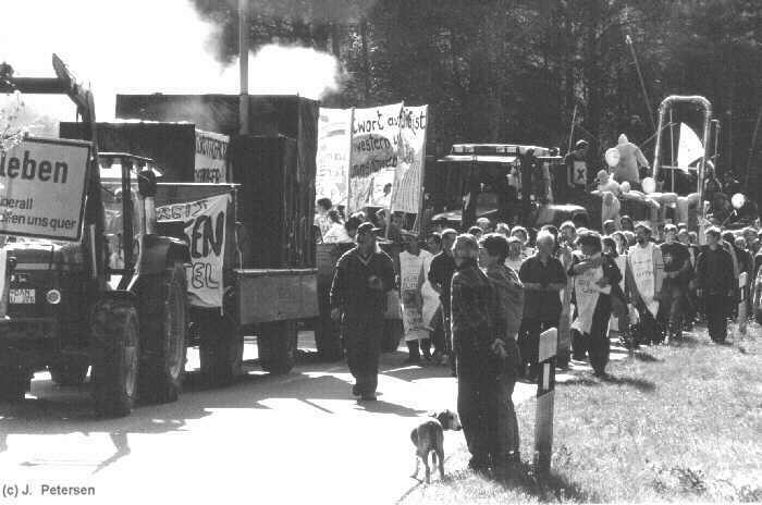 Die Nagelprobe bestanden! Eine ganz große Bereicherung der Demonstrationszüge sind die Traktoren der Bäuerlichen Notgemeinschaft und anderer Landwirte! Mit beeindruckenden Aufbauten, Dekorationen und Plakaten verleihen sie den Zügen eine besonders kraftvolle Note. Der mächtig qualmende Aufbau auf einem der Anhänger soll die Pilotkonditionierungsanlage in Gorleben darstellen. 5000 AKW-GegnerInnen versammelten sich am Samstag, den 23.09.00 zu einer unerwartet großen Demonstration vor den Atomanlagen im Wald bei Gorleben. Damit hat die Anti-AKW-Bewegung überaus eindrucksvoll gezeigt, daß mit ihr wieder zu rechnen ist, wenn in nächster Zeit wieder Atomtransporte rollen sollen. (08.10.00) |