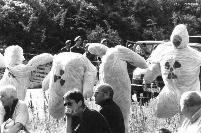 "Auch hier wollen wir nicht tot überm Zaun hängen!" Kreative Einfälle bereichern jede Demo: Eine Gruppe aus Osnabrück hatte die weißverkleideten Strohpuppen über den Zaun vor einer der gut bewachten Atomanlagen in Gorleben gehängt, zusammen mit einem Transparent mit o.a. Text. 5000 AKW-GegnerInnen versammelten sich am Samstag, den 23.09.00 zu einer unerwartet großen Demonstration vor den Atomanlagen im Wald bei Gorleben. Damit hat die Anti-AKW-Bewegung überaus eindrucksvoll gezeigt, daß mit ihr wieder zu rechnen ist, wenn in nächster Zeit wieder Atomtransporte rollen sollen. (22.10.00) |