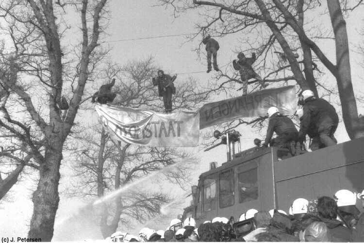 Aus dem Fotobericht von bildzeichen (März 97): "Während die Wasserwerfer ihre Fontänen in die Menschen jagen und dann vorweg ein Polizeikommando mit Gummiknüppeln und Fäusten blindlings auf Köpfe und Körper unter Planen prügelt und dann abräumt, widersteht darüber auf Seilen zwischen Eichenbäumen ein Mädchen-Quartett und sorgt durch souveräne Präsenz oberhalb der Polizeimacht dafür, daß die Stimmung links und rechts der Straße nicht überkocht. Als diese schließlich geräumt ist, ist die Seilgruppe immer noch oben, in offensichtlich blendender Stimmung, und alle Hoffnung der Anwesenden projiziert sich jetzt in deren Standhaftigkeit." Nach dem gründlichen Versagen der Bundesregierung bei den Bemühungen um einen schnellen Ausstieg aus der Atomwirtschaft kann nur noch ein fortgesetzter außerparlamentarischer Widerstand den Ausstieg beschleunigen. Mit den wöchentlich ausgewählten Fotos aus unserem Archiv wollen wir an die vielen bisher geleisteten Einsätze der AtomkraftgegnerInnen erinnern und zu weiterem Widerstand ermutigen. |