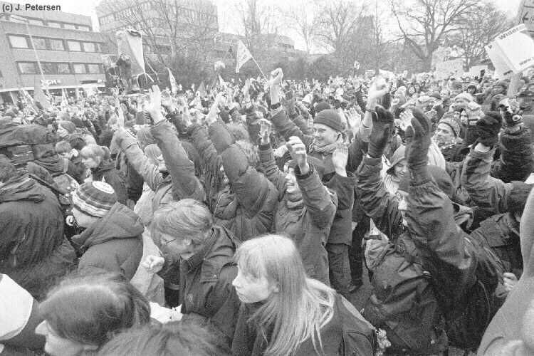 © Gisela und Joachim Petersen, subkontur Castor 2001: 16000 AtomkraftgegnerInnen auf der Großdemo in Lüneburg am 24.03.01. Begeistert wird die Querstell-Übung mitgemacht! ... und so wird's vorgemacht! Castor2001