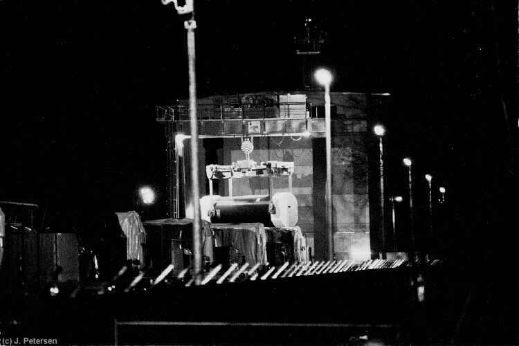 © Gisela und Joachim Petersen, subkontur Castor 2001: Castor "am Haken" (Telefoto), Dannenberg am 28.03.01.Fotografenmühe: aus der Ferne wird per Teleobjektiv das Umladen der Castor-Behälter fotografiert (s.u.).