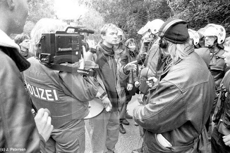 an der Aktion "Ausrangiert" beteiligten Gruppen verhandelt mit dem Einsatzleiter der Polizei