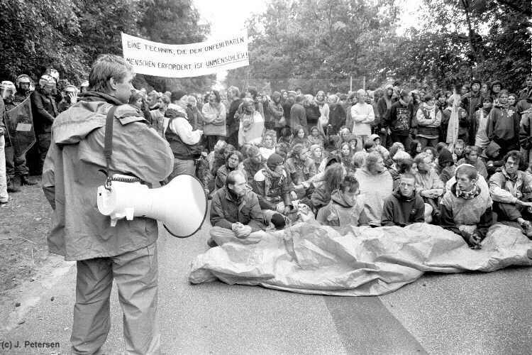 Nr. 5 © Gisela und Joachim Petersen, subkontur Das Ergebnis der Verhandlungen wird per Megaphon den SitzblockiererInnen mitgeteilt.
