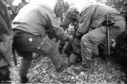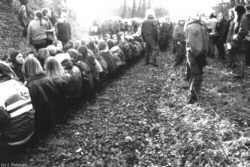 Dritter Castor-Transport nach Gorleben: Blockade der Bahnstrecke Lüneburg - Dannenberg bei Wendisch-Evern am 03.03.97 Nachdem es nun festzustehen scheint, daß der vierte Castor-Transport ins Wendland Dannenberg voraussichtlich am 27. März erreichen soll, formiert sich bundesweiter Widerstand. Aus den Erfahrungen des dritten Transportes im März 1997 wurde nun die Widerstandsstrategie verändert: Statt einer massiven Präsenz am Verladekran in Dannenberg soll nun die gesamte Castor-Strecke zwischen Lüneburg und Gorleben (ca. 70 km) in das Blockadekonzept einbezogen werden. Dabei kommt der Bahnstrecke zwischen Lüneburg und Dannenberg (ca. 50 km) eine besondere Bedeutung zu. In diesem strategischen Zusammenhang soll hier an eine erfolgreiche Gleisblockade des dritten Castortransportes bei Wendisch-Evern in der Nähe von Lüneburg am 03. März 1997 erinnert werden: Nach einer kurzen morgenlichen Gleisblockade am Bahnhof Lüneburg versammelten sich lüneburger Castor-DemonstrantInnen zu einem Widerstands-Frühstück auf dem lüneburger Marktplatz. Anschließend zogen sie durch die Innenstadt und veranstalten an mehreren Plätzen ein sogenanntes "Die-in", um die Öffentlichkeit zu mobilisieren. Nachdem dann in den Nachrichten bekannt geworden war, daß der Castor-Transport Göttingen passiert hatte, allerdings mit einstündiger Verspätung wegen einer dortigen Blockade, und nun auf dem Weg nach Lüneburg war, begaben sich gegen 16.00 Uhr etwa 250 DemonstrantInnen kurzentschlossen zur Gleisblockade auf die Schienen bei Wendisch-Evern. Die dort anwesenden BeamtInnen des Bundesgrenzschutzes waren durch diese plötzliche Aktion zunächst völlig überrumpelt und zahlenmäßig nicht in der Lage, um wirksam einzugreifen. So verhallte die Aufforderung, das besetzte Gleis zu räumen. Erst nach ca. einer halben Stunde traf dann erste polizeiliche Verstärkung aus Lüneburg ein. Wenig später traf eine weitere Polizeitruppe ein, die mit Hubschraubern aus dem Wendland eingeflogen worden war. Dann erst konnte die Räumung des Gleises beginnen: Die DemonstrantInnen ließen sich von den Gleisen tragen, setzen sich aber an anderer Stelle wieder darauf nieder. Unter Erfolgsdruck stehend, ging die Polizei nun im Verlauf der weiteren Räumung teilweise hart gegen die BlockiererInnen vor. Zum Glück wurde aber niemand ernsthaft verletzt. Schließlich gelang es den etwa 450 BeamtInnen von BGS und Polizei, die DemonstrantInnen in einem Kessel einzuschließen und das Spiel der wiederholten Gleisbesetzung zu beenden. Während dieser Phase wurden Fotografen und Kameraleute massiv bei ihrer Öffentlichkeitsarbeit behindert und erhielten schließlich Platzverweise. Man darf mit Fug und Recht vermuten, daß lediglich die starke Präsenz der Presse den Einsatz härterer Mittel durch die Polizei (z.B. Schlagstockeinsatz) verhindert hatte. Nach ca. einer Stunde Zwangsaufenthalt konnte der Castor-Transport seinen Weg bis zum nächsten Hindernis (auf den Gleisen bei Dahlenburg) fortsetzen. (erstmals veröffentlicht bei bildzeichen am 24.03.97) |