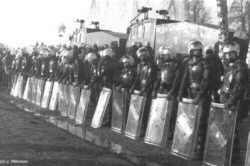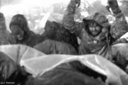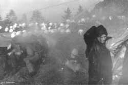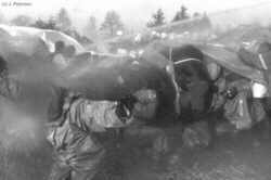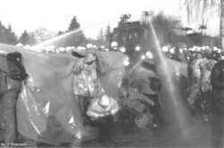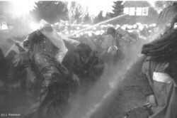 Xtausendmal nass - Castorblockade am 05./06.03.97 bei Dannenberg"Um die schleppend vorangehende Räumung zu beschleunigen, setzt die Polizeiführung ab morgens 5 Uhr auf den Einsatz von Wasserwerfern. Die machen zwar den Aufenthalt auf der Straße wegen der ohnehin frostigen Nacht noch ungemütlicher, bringen aber zunächst nicht den gewünschten Erfolg. Die DemonstrantInnen versuchen, sich mit großen Plastikplanen gegen die Nässe zu schützen. Wo Planen durch Räumung freigeworden sind, werden sie sofort nach hinten gereicht, um wieder Schutz zu gewähren. Die Stimmung bei den DemonstrantInnen ist trotz der Unverhältnismäßigkeit des Wasserwerfereinsatzes nach wie vor gut. Erst als gegen 7 Uhr die Magdeburger Knüppelgarde ins Rennen geschickt wird und der Wasserwerfer nun pausenlos seine Fontänen niederregnen läßt, wird die Stimmung gereizter. Mittlerweile gibt es auch erste durch Polizeiübergiffe verletzten DemonstrantInnen." (aus dem Bericht von bildzeichen) |