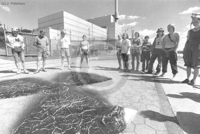 Nr. 5 © Gisela und Joachim Petersen, subkontur Kurzes Gedenken vor dem aus Ruß gebildeten Symbol. Dieses weckt Assoziationen an die radioaktiv verbrannte Erde in Hiroshima und Nagasaki und Tschernobyl.