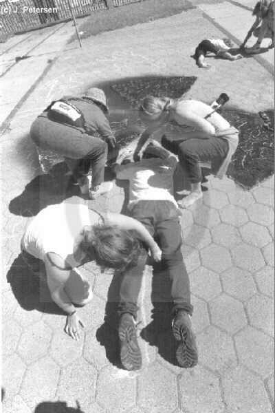 Ihre Körper werden als Kreideumriß abgebildet und sollen symbolisch auf die vielen Opfer des atomaren