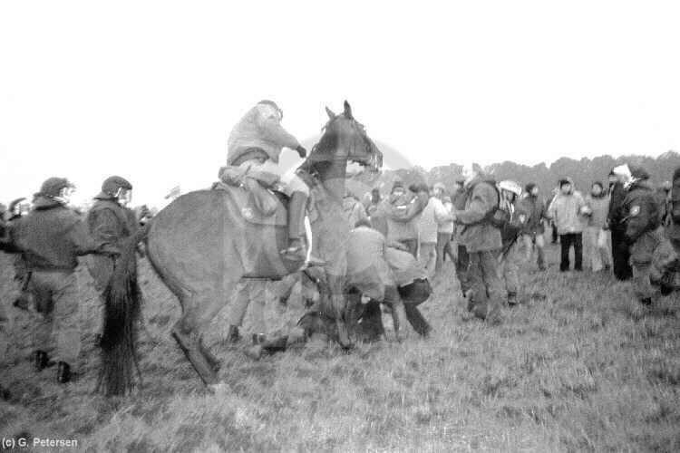 Nr. 11 © Gisela und Joachim Petersen, subkontur Als Greiftrupps der Polizei zum Abgreifen von DemonstrantInnen auf den Acker ausschwärmen, beginnt dort eine wilde Hatz. Polisten galoppieren in die Menge. Dabei kommen DemonstrantInnen zu Fall.
