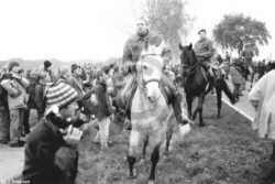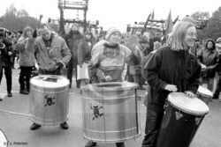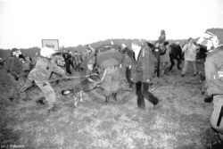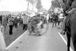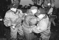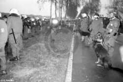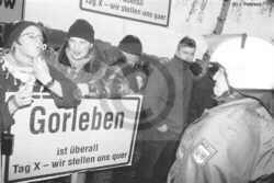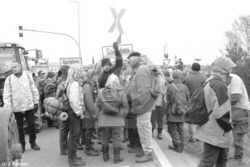 Aktion WiderSetzen zwischen Dannenberg und Splietau am 11.11.01Etwa tausend TeilnehmerInnen der Aktion WiderSetzen brachen am frühen Sonntagnachmittag von einer durch 80 Traktoren besetzten Kreuzung in Dannenberg auf, um auf die Castortransportstrecke bei Splietau zu gelangen. Obwohl die Aktion als gewaltfreie Sitzblockade in der Demonstrationsverbotszone von vornherein angekündigt worden war und das ganze Treiben von Hubschraubern aus verfolgt wurde, gelang es den AktivistInnen, auf einem Umweg über Äcker und Felder bei Splietau bis an die Strecke zu gelangen. Die Polizei konnte schnell ein großes Aufgebot an Einsatzkräften mobilisieren, verstärkt mit je einer Pferde- und Hundestaffel. Dennoch gelang es immer wieder Gruppen von WiderSetzerInnen, die Straße zu betreten und sich dort kurzzeitig niederzusetzen. Bei den anschließenden Räumungen wurden sie weggetragen oder -geschleift, teilweise wurden dabei auch schmerzhafte Zwangsmittel wie der Griff in die Augen, in den Halsbereich oder das Verdrehen von Armen und Händen angewendet. Während der bis in die Nacht dauernden Aktionen wurden etwa 100 WiderSetzerInnen und der Pressesprecher der Kampagne X-tausendmal quer, Jochen Stay, in polizeiliches Gewahrsam genommen, später aber wieder freigelassen. |