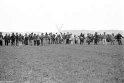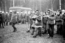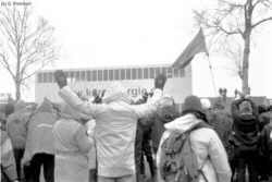 Castor 2001 Versuch einer Castor-Blockade am 29.03.01 in Laase Nach den beiden Gleisblockaden bei Wendisch-Evern am 26. und 27.03. hatte X-tausendmal-quer für den 28.03. zur Blockade bei Laase (Castor-Straßenstrecke) mobilisiert: "So nah am Durchbruch waren wir noch nie. Kommt ins Wendland. Beteiligt Euch am Ausstieg" (SMS). Am frühen Morgen des 20.03. drohte die Polizei, das Camp in Laase einzukesseln und zu räumen. Daraufhin entschloß man sich, zur Straße Laase - Gorleben aufzubrechen, um dort den Castor zu blockieren. Als die ca. 2000 TeilnehmerInnen dort ankamen, war bereits die Polizei mit einigen Hundertschaften und einer Reiterstaffel vor Ort. Ferner wurden weitere Polizeibeamten per Hubschrauber eingeflogen. Die DemonstrantInnen verzichteten auf einen gewaltsamen Durchbruch durch die Polizeikette. Überraschend schnell traf dann der Kordon mit den sechs Castor-Tiefladern ein und rollte ohne Unterbrechung an den zunächst enttäuschten ZuschauerInnen vorbei. Kurz danach aber bildeten sie alle zusammen einen großen Kreis, in dessen Mitte sich zwei lange Menschenketten zu einem X formierten. Dieses Symbol des Widerstandes löste sich dann zu einem ausgedehnten Zug auf, an dessen Spitze eine Musikantengruppe für aufrichtende Stimmung sorgte, die auf alle übergriff. So feierte man denn alle Aktionen als einen großen Erfolg, fest entschlossen, sich beim nächsten Castor-Transport wieder querzustellen. |