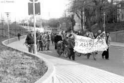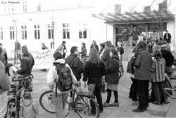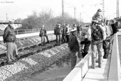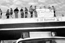 Lüneburg: Spontan-Demo gegen Castor-Transport am 23.04.01 "In Lüneburg haben am heutigen Montagabend in einer spontan organisierten Demo etwa 35 AtomkraftgegnerInnen gegen die bevorstehenden Castortransporte von Neckarwestheim nach Sellafield (Großbritannien) protestiert. Der Demozug bewegte sich mit Polizeibegleitung durch die Innenstadt zum Bahnhof. Dort angekommen verließen die DemonstrantInnen blitzschnell die Straße und besetzten eine Bahnbrücke, über welche das Castorgleis nach Dannenberg führt. Dort entrollten sie ein großes Transparent gegen Atomtransporte. Nach etwa einer Viertelstunde verließen sie die Brücke und zogen zum Bahnhofsvorplatz. Dort veranstalteten sie ein sogenanntes DieIn. Die Kreideumrisse von liegenden menschlichen Figuren sollten auf die verschiedenen Atomstörfälle und deren Gefahren hinweisen. Nach etwa einer Stunde löste sich die Demo wieder auf. Es gab keinerlei Zwischenfälle." (unser Text bei Indymedia.de) |
