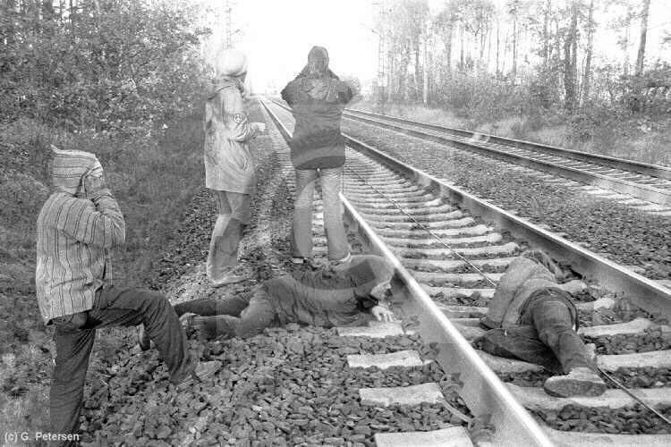 Nr. 1 © Gisela und Joachim Petersen, subkontur Ca 9.30 Uhr: gelungene Ankettung durch ein Rohr unter der Schiene. Die Ankunft des Castor-Zuges steht kurz bevor.