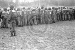 Castor 2001 Versuch einer Castorblockade bei Seerau am 28.03.01 Mindestens 500 Menschen hatten sich am Mittwochnachmittag auf einem Acker bei Seerau versammelt, um von dort aus das naheliegende Castorgleis zu blockieren. Eine Sitzblockade am Rande des Gleises wurde von der in Überzahl anwesenden Polizei/BGS schnell wieder geräumt. Wasserwerfer fuhren entlang der Bahnböschung bedrohlich hin und her . Als sich der Castorzug näherte, wurden die DemonstrantInnen aufgefordert, den 50-Meter-Korridor zu verlassen, anderenfalls würden die Wasserwerfer eingesetzt. Als schließlich mehrere Hundertschaften der Polizei im Laufschritt auf die DemonstrantInnen zustürmte, wichen diese bis zum geforderten Abstand zurück. Beim Anblick des im Schritttempo fahrenden Castorzuges brach lautstarker Protest aus. |