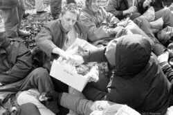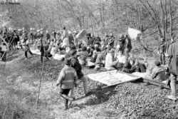 Castor 2001 X-tausendmal-quer: Gleisbesetzung bei Wendisch-Evern am 26.03.01 Teil 1: Besetzung des Gleises Wendisch-Evern, am 26.03.01: Es ist ca. 13.30 Uhr, als wir im Camp ankommen. Dort herrscht reges Treiben, Isomatten und Schläfsäcke werden zusammengerollt und verpackt und Essen wird eingenommen. Man bereitet sich auf eine erste Besetzung des Castor-Gleises am frühen Nachmittag vor. Kurz darauf wird der Rat der BezugsgruppensprecherInnen einberufen. Letzte Absprachen werden getroffen, dann kommt mit einem Mal große Bewegung ins Camp. Die SprecherInnen rufen laut verschiedene Kennworte aus. Das ist das Zeichen für die einzelnen Gruppen, sich zu versammeln. Kurz werden Information gegeben. Dann marschieren auch schon fast tausend gutgelaunte und festentschlossene Leute zügig in Richtung Gleis los. Zunächst in zwei getrennten Zügen, um die Polizei zu irritieren. Man will deren zur Zeit noch dünne Präsenz unbedingt ausnutzen, um einen Durchbruch zum Gleis zu schaffen. Schließlich schwenken beide Züge in die gleiche Richtung. Mühsam geht's jetzt querfeldein über Äcker, Wiesen und durch Wald. Stacheldrahtzäune sind zu queren, und das alles schwerbepackt mit Materialien, die das Leben während einer langen Besetzung erleichtern sollen: Strohsäcke, Matten, Schlaf- und Rucksäcke. Immer wieder werden die Hastenden per Megaphon zu weiterer Eile aufgerufen, um der Polizei zuvorzukommen. Schließlich ist hohe Böschung erreicht. Unten liegt das Gleis. Jetzt noch einige zwanzig, dreißig Meter Kletter- oder Rutschpartie abwärts und das Ziel des Begehrens ist erreicht. Erleichterung! Nun richtet man es sich im Gleisbett ein, so bequem es irgend geht. Alle genießen diesen Teilerfolg und die Stimmung ist dementsprechend gut. Der ebenfalls herbeigeeilten aber zahlenmäßig unterlegenen Ordnungsmacht bleibt nichts anderes übrig, als dem munteren Treiben zunächst tatenlos zuzusehen. //// Teil 2: Versuch einer Räumung //// Teil 3: Entschlossener Widerstand |