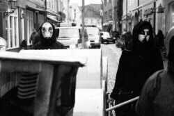 Castor 2002: Theateraktion in Lüneburg gegen den bevorstehenden Castor-Transport am 08.11.02Ein zu einer Lokomotive verkleideter selbstfahrender Rasenmäher mit zwei Anhängern und gelben Atommüllfässern, ein sinnbildlicher Castorzug also, erregte bei den PassantInnen in der Innenstadt von Lüneburg einiges Aufsehen. Vom Tod im schwarzen Gewand und von einem provozierenden "Polizeiaufgebot" begleitet, sollte der knatternde Zug möglichst reibungslos und schnell das Zwischenlager in Gorleben erreichen. Doch AtomkraftgegnerInnen machten diese Absicht zunichte, indem sie sich immer wieder vor den "Zug" setzten und diesen sehr zum Ärger der "Polizei" an einer Weiterfahrt hinderten. Dann folgte stets die altbekannte Prozedur: mehrmalige Aufforderung zum Verlassen des "Gleises", Weigerung und heftige Proteste der DemonstrantInnen und schließlich Wegtragen, -zerren und -schleifen unter Einsatz des Schlagstockes. Alles dieses rollenmäßig gut eingefühlt und gespielt von den AkteurInnen, die wohl sämtlich ihre eigenen Erfahrungen in diese Aktion einbringen konnten. Weitere Fotos werden wir nach Aufarbeitung des Castor-Transportes ergänzen. Hintergrund dieser Aktion war: "Sitzen ist eine Straftat Im Mai 2001 stoppten circa 50 Atomkraftgegnerinnen und Gegner einen Atommülltransport aus dem AKW Brunsbüttel und Stade, der nach La Hague gehen sollte. Sie saßen ungefähr 10 Minuten auf den Gleisen in der Nähe des Lüneburger Bahnhofs, bis die Blockade von der Polizei aufgelöst wurde. Willkürlich ausgewählt erhielten knapp 20 Beteiligte einen Strafbefehl. Ihnen wird vorgeworfen, eine "schwere Straftat" nach §316 b (Störung öffentlicher Betriebe, Geldstrafe bis zu 10 000 Euro oder Haft bis zu 5 Jahren) begangen zu haben. Der Verteidiger hatte in einem ersten Gerichtsverfahren gegen eine der Demonstrantlnnen im April auf Freispruch plädiert. Die aufgrund der Gleisblockade hervorgerufenen 30 Verspätungen seien aufzuholen gewesen, zudem schränke das Strafgesetzbuch nicht die Meinungsfreiheit ein. Letztendlich verurteilt wurde die Demonstrantin jedoch nach § 316 b, mit einer Geldstrafe von 626,12 Euro. Die geforderte Berufung sowie weitere Verfahren stehen noch aus. Das Verfahren gegen die Demonstrantin wird mittlerweile von den Gerichten als Präzedenzfall behandelt und würde weiteren unverhältnismäßigen Verurteilungen den Weg ebnen. Was bei jeglichen früheren Gleisblockaden bisher als Ordnungswidrigkeit wie zum Beispiel falsches Parken behandelt wurde, soll nun als Straftat geahndet werden. Hier wird versucht, die Grundrechte auf Versammlungsfreiheit und freie Meinungsäußerung massiv einzuschränken und Menschen, die diese in Anspruch nehmen, zu kriminalisieren. Menschen, die sich im Rahmen ihrer demokratischen Rechte für eine lebenswerte Zukunft einsetzen, sollen bewusst eingeschüchtert werden." (www.trainstopping.de) |
