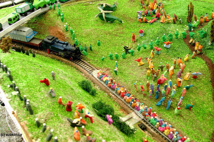 Großer Andrang bei der AG Bahn: Auf einer Castor-Bahnstrecke von Lüneburg bis Dannenberg im Maßstab 1 : 87 rollt ein Castor-Transport. Castor-Stopp-Aktionen wie Gleisbesetzungen oder Einsturz einer Brücke werden dargestellt. Jung und Alt bestaunen die in mühevoller Kleinarbeit gefertigte Präsentation.