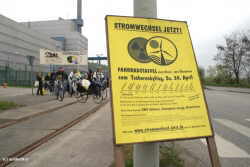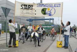 fotografie / presse-archiv© Gisela und Joachim PetersenKontakt: siehe Startseite STARTSEITE Weg vom Atomstrom - Fahrradstaffel für einen StromwechselX-tausendmal quer - Hamburg Arbeitsgruppe FahrradstaffelROBIN WOOD Hamburg, 24.04.2004 Pressemitteilung STROMWECHSEL JETZT! Umweltschützerlnnen werben heute mit einer Fahrradstaffel durch Hamburg für Ökostrom Vor dem AKW Krümmel haben Umweltschützerlnnen heute Vormittag eine Fahrradstaffel gestartet, mit der sie zum Wechsel des Stromanbieters ermuntern wollen. Die Tour, zu der die Initiative X-tausendmal quer, ROBIN WOOD und viele anderen Umweltgruppen aufgerufen haben, wird bis zum Sitz der Betreibergemeinschaft Windstrom Wedel in der Werkstatt 3 in Hamburg-Altona führen. Zwischendurch wollen die Radlerlnnen an etlichen Stellen anhalten, um Passantlnnen darüber zu informieren, wie einfach und sicher ein Wechsel zu einem Okostrom-Anbieter ist. Mit der Fahrradstaffel erinnern die Hamburger Umweltschützerlnnen auch an die Katastrophe von Tschernobyl, die sich am 26. April zum 18. Mal jähren wird. Vor dem HEW-Kundenzentrum an der Spitalerstraße wird aus diesem Grund ab 15:00 Uhr eine Mahnwache abgehalten. Uber die Folgen der Reaktorkatastrophe in Tschernobyl wird der Münchner Professor Edmund Lengfelder am Abend in einer Live-Schaltung berichten. Lengfelder ist maßgeblich am Aufbau und Betrieb eines Schilddrüsenzentrums im weißrussischen Gomel beteiligt. "Auch 18 Jahre nach dem Tschernobyl-UnfaII sind die Folgen dieser Reaktorkatastrophe noch nicht abschätzbar", weiß Lengfelder. "Zehntausende der 800.000 Aufräumarbeiter sind bereits tot. Im am stärksten betroffenen Weißrussland nimmt der Schllddrüsenkrebs nach einem dramatischen Anstieg immer noch zu. Im zehnfach dichter besiedelten Westeuropa - mit 200 Reaktoren - wären die gesundheitlichen und sozialen Folgen einer solchen Katastrophe noch weitaus schlimmer." Im Wissen um die unbeherrschbaren Gefahren der Atomenergie hat sich die Mehrheit der deutschen Bevölkerung gegen die Nutzung der Atomenergie ausgesprochen. Trotzdem wird nach wie vor knapp ein Drittel des in Deutschland produzierten Stroms in Atomreaktoren erzeugt. Gut die Hälfte stammt aus Kohlekraftwerken, deren Abgase das Klima erheblich belasten. Auch die Hamburgerlnnen, die ihren Strom bei der HEW beziehen, unterstützen auf diesem Wege - überwiegend ungewollt - die Atomindustrie. Dabei ist der private Ausstieg ganz einfach. "Trauen Sie sich! Wechseln Sie zu einem ökostrom-Anbieter und wir kommen gemeinsam dem Atomausstieg ein Stückchen näher", appellierte eine Sprecherin der Fahrrad-Crew an die Hamburgerlnnen. Nach der Tour wird gefeiert. Ab 17 Uhr beginnt in der Werkstatt 3 in Hamburg-Altona eine Party mit Musik und Informationen über alternative Stromquellen. Für Rückfragen: Jürgen Fahrenkrug, X-tausendmal quer - Hamburg, 0179 / 991 37 58 Bettina Dannheim, ROBIN WOOD, 0171 / 835 95 15 und ROBIN WOCD-Pressestelle, 040 / 380 892 0 Folgende Organisationen beteiligen sich an der Kampagne STROMWECHSEL JETZT! AIDA - Aktionäre im Dienste des Ausstiegs, Betreibergemeinschaft Windstrom Wedel, ContrAtom Buchholz, Deutsche Umweltstiftung Germersheim, Deutscher Jugendbund für Naturbeobachtung, Eurosolar - Regionalgruppe Hamburg, Grüne Jugend Lüneburg, Hausstrom Saarlandstraße, Hamburg, IPPNW (Internationale Arzte gegen den Atomkrieg) - Regionalgruppe Hamburg, Öko AG attac Hamburg, REGENBOGEN Bergedorf, RadioAktiv (Sendung auf FSK Hamburg, 93,0 MHz /101,4 Kabel), ROBIN WOOD, SAND Hamburg, Tschernobylgruppe Hamm-Horn, Umweltgruppe Elbvororte, VERBRAUCHER für unbelastete Nahrung, X-tausendmal quer - Regionalgruppe Hamburg Fotos von der Tour werden im Laufe des Tages veröffentlicht unter: www.stromwechsel-jetzt.de/pressebilder Die folgenden Fotos können als JPG 750x500 zur Ansicht geladen werden. Wir weisen in diesem Zusammenhang ausdrücklich auf unser Copyright hin! | |