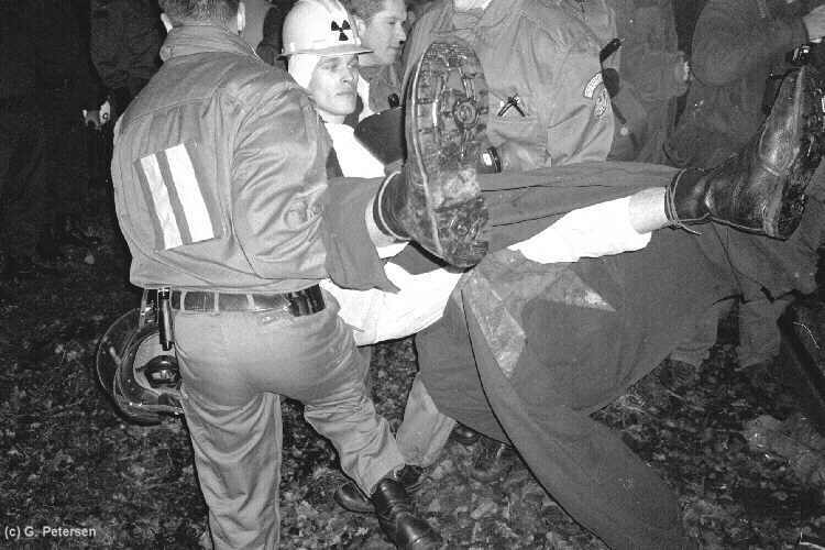Etwa 300 AtomkraftgegnerInnen hatten sich am Sonnabend, den 3. März im wendländischen Ort Pisselberg zu der Gleisaktion "Eine Nacht im Gleisbett" eingefunden. Gegen 18.30 Uhr gelang es einer Gruppe von 70 bis 80 DemonstrantInnen, das Castor-Gleis zum ersten Mal zu vereinnahmen. Der erste Räumungseinsatz von Polizei und BGS erfolgte prompt (s. Foto o.). Trotz Eiseskälte fanden bis zum frühen Morgen auf Straße und Schiene weitere Widerstandsaktionen statt. 36 Personen wurden im Laufe der Nacht in polizeilichen Gewahrsam genommen.