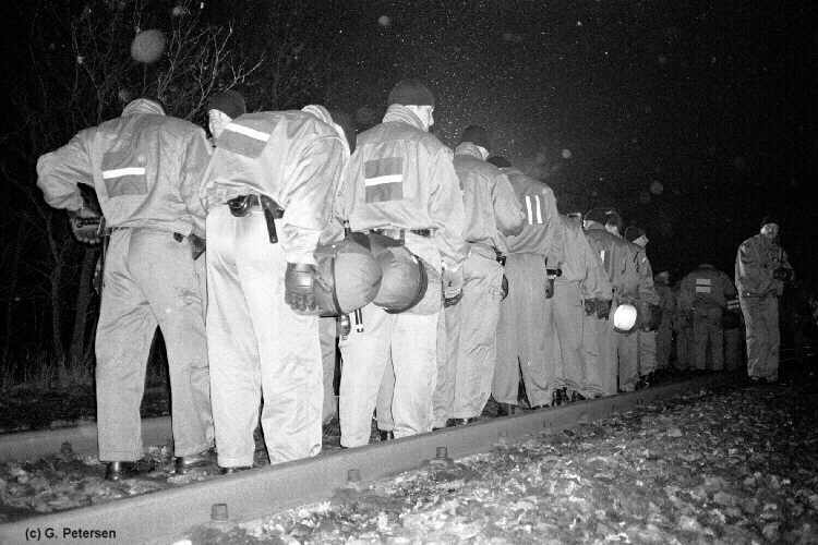 Etwa 300 AtomkraftgegnerInnen hatten sich am Sonnabend, den 3. März im wendländischen Ort Pisselberg zu der Gleisaktion "Eine Nacht im Gleisbett" eingefunden. Gegen 18.30 Uhr gelang es einer Gruppe von 70 bis 80 DemonstrantInnen, das Castor-Gleis zum ersten Mal zu vereinnahmen. Der erste Räumungseinsatz von Polizei und BGS erfolgte prompt (s. Foto o.). Trotz Eiseskälte fanden bis zum frühen Morgen auf Straße und Schiene weitere Widerstandsaktionen statt. 36 Personen wurden im Laufe der Nacht in polizeilichen Gewahrsam genommen.