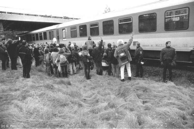 Ein Triebwagen aus Dannenberg unterbricht den Gleisspaziergang für kurze Zeit. Die Reisenden winken solidarische Grüße.