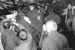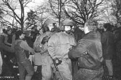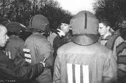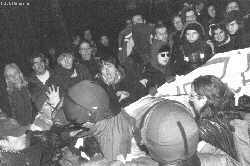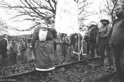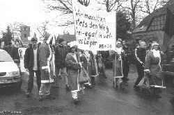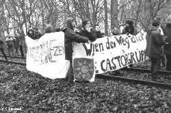 Nikolausis! Castor-Brücken-Demo in Pisselberg Etwa 500 AtomkraftgegnerInnen trafen sich am 03.12.00 in Pisselberg (bei Dannenberg), um gegen die für den kommenden März geplanten Castor-Transporte nach Gorleben und gegen den damit zusammenhängenden Abriß und Neubau der Jeetzel-Brücke bei Seerau zu demonstrieren. Bereits jetzt befindet sich das Wendland schon wieder im polizeilichen Belagerungszustand, da die Brückenbaustelle mit einem großen Polizei- und BGS-aufgebot abgesichert wird. Seit Wochen werden die Personalien eines jeden "Verdächtigen" notiert und sogar Platzverweise ausgesprochen. Kein Wunder also, daß die betroffene Bevölkerung des Wendlandes extrem frustiert ist und schnell Volkes Zorn hochkocht, wenn es zu Konfrontationen mit der Polizei kommt. Da gegen den Brückenabriß immer noch Klagen anhängig sind, will die BI Lüchow-Dannenberg mit ihren Aktionen den Zeitplan für die Brückenbauarbeiten immer wieder durchkreuzen. Sehr anschaulich wurde dieses, als es etwa 300 AtomkraftgegnerInnen gelang, für ca. eine Stunde das Castor-Gleis in der Nähe der Baustelle für etwa eine Stunde zu besetzen, um es dann wieder freiwillig zu räumen. Parallel dazu gelang es einer Gruppe, mit einem Schlauchboot auf der Jeetzel bis zur Baustelle vorzudringen. Gemeinsam mit Treckern, Pontons und einem Förderband konnten dann DemonstrantInnen die Jeetzel überqueren und zur Baustelle gelangen. |