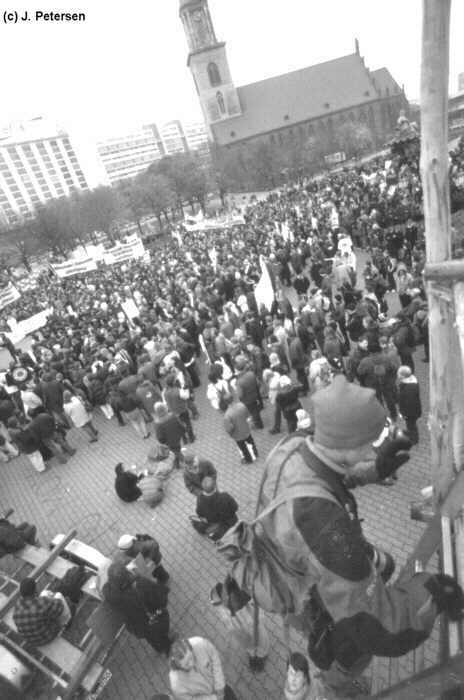 Kundgebung mit etwa 10000 TeilnehmerInnen auf dem Alexanderplatz. Dieses Foto von einem Holzturm aufgenommen, den die LIgA (Lüneburger Initiativen gegen Atomanlagen) auf dem Alexanderplatz aufgestellt hatten. |