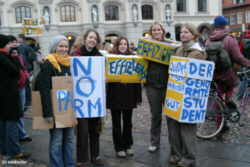 fotografie / presse-archiv© Gisela und Joachim Petersen, subkonturKontakt: siehe Startseite STARTSEITE Kreativer Protest bei Studentendemonstration durch die Innenstadt LüneburgsBunt ging es zu auf dem Uni-Campus, wo sich am 20. Januar 2004 etwa 1400 StudentInnen zu einer Protestdemonstration versammelten. Viele „letzte Hemden“ flatterten an langen Wäscheleinen vor dem Gebäude 9 und zeigten symbolisch die Situation vieler Anwesender, sollten tatsächlich Studiengebühren eingeführt werden. Satirisch treffend die Text-Metaphern auf Großtransparenten wie: „Strathmann dreht die Bildung durch den Wulff.“Dann bewegte sich ein langer, plakatbunter und zuweilen lauter Zug vom Campus in die Lüneburger Innenstadt. Während häufiger kurzer Stopps wurden Protest- und Kampfbereitschaft skandiert: „Sie wollen kürzen, wir werden kämpfen!“ Dann wieder erklang aus vielen Kehlen eine Variante des allbekannten Sesamstraßenliedes: „Wer, wie, was, wieso, weshalb, warum – wer nicht zahlt bleibt dumm.“ Auf dem Platz Am Sande angekommen, sorgten die StudentInnen für Aufsehen und auch Erheiterung, als sie auf Kommando ein Bildungssterben inszenierten und sich zu Hunderten auf den Boden fallen ließen. Einen weiteren sinnfälligen Halt gab es dann vor dem Hauptgebäude der Sparkasse an der Münze. Hier wurde laut und öffentlich die ironische Frage nach der Kreditwürdigkeit studienverarmter StudentInnen gestellt. Sie gipfelte in der erstaunt geäußerten Erkenntnis, dass in Bezug auf die Studiengebühren ein Kreditpotential von etwa einer halben Million Euro vor dem Eingang zur Sparkasse stehe. Den Abschluss der Demonstration bildete dann eine Kundgebung auf dem Marktplatz. Hier sicherte der Regionalvorsitzende des DGB Dietrich den StudentInnen die Unterstützung der Gewerkschaft zu. Als sehr erfreulich ist die Tatsache zu bewerten, dass die StudentInnen den geplanten Bildungsabbau in einem engen Kontext mit dem Sozialabbau in dieser Gesellschaft verstehen, was sie in mehreren Redebeiträgen und ferner auf etlichen ihrer Plakate zum Ausdruck brachten. Weitere Informationen gibt es beim ASTA der Universität Lüneburg. Die folgenden Fotos können als JPG 750x500 zur Ansicht geladen werden. Wir weisen in diesem Zusammenhang ausdrücklich auf unser Copyright hin! | |