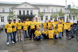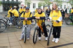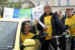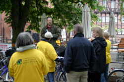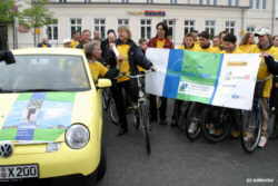 fotografie / presse-archiv© Gisela und Joachim PetersenKontakt: siehe Startseite STARTSEITE Klimastaffel 2004 auf Tour durch alle Bundesländer - eine Klima-Bündnis-AktionMitmachen, gemeinsam ein Zeichen setzen für den Klimaschutz und den Einsatz erneuerbarer Energien: das können alle und wollen viele innerhalb der nächsten 3 Wochen (10. Mai -1. Juni).Auch Lüneburg ist dabei mit einer Fahrradstaffel. - Treffpunkt ist der Lüneburger Bahnhof am 12. Mai, 11.00 Uhr. Auf dem Bahnhofsplatz warten SchülerInnen der Klasse 8/1 von der Hauptschule Kaltenmoor auf den Staffelstab aus Dannenberg. In ihren leuchtend gelben Klimaschutz-T-Shirts gruppieren sie sich gerne für ein Foto. Und bitte noch ein Foto - die Fahrräder sollen doch mit aufs Bild. Schnell werden die abgestellten Drahtesel geholt. Das Engagement für eine gute Sache ist zu spüren. Ein 3-Liter VW Lupo - ein mit Rapsöl betanktes Auto aus Dannenberg - trifft ein. Der Fahrer Dieter Schaarschmidt, Überbringer des Staffelstabes wird von den SchülerInnen und den anwesenden Mitgliedern des Umweltausschusses der Stadt, Studierenden und Mitarbeitern der Stadtverwaltung umringt. Ein Transparent wird entfaltet, Andrea Schröder-Ehlers, Fachbereichsleiterin der Stadt, fährt mit ihrem Fahrrad vor und nimmt den durch das heruntergekurbelte Autofenster gereichten Stab entgegen. Dann wird aufgesessen, und ab geht's in Begleitung eines ebenfalls radelnden Polizisten in die Stadt zur Wasserkraftanlage an der Ilmenau und zur Fotovoltaikanlage der katholischen Kirche St. Marien. Nach diesem informativen Zwischenstopp in Lüneburg wurde der Stab von Sebastian Bathiany zur Weitergabe nach Hamburg gebracht. Der Startschuss zur Klimastaffel 2004 ist am 10. Mai in Kiel gefallen. Jeder Beitrag zur 3600 km Staffelroute von Kiel über die Landeshauptstädte der 16 Bundesländer bis nach Bonn ( Laufen, Radeln, Skaten, Reiten, Rudern, Segelfliegen...) ist willkommen. Auf dieser Strecke wird ein Staffelstab mitgeführt, der die Klimastaffel-Deklaration enthält, die in den Landeshauptstädten von den jeweiligen UmweltministerInnen unterzeichnet werden soll. Auf diese Weise wird dem Anliegen des Klima-Bündnisses, das Weltklima zu schützen und die regenerativen Energiequellen auszubauen, Nachdruck verliehen. Städte und Gemeinden haben zudem die Möglichkeit, ausgewählte Projekte als Beispiele für regenerative Energien zu präsentieren. Die auf 120 Etappen verteilten Stabübergaben, die hier und da mit informativen Stadtrundfahrten gekoppelt werden, finden ihren Abschluß am 1. Juni, wenn der Staffelstab zum Auftakt der Internationalen Konferenz für erneuerbare Energien "Renewables 2004" in Bonn Bundesumweltminister Jürgen Trittin überreicht wird, sozusagen als Zeichen vieler "bewegter" BürgerInnen für ihre besorgte Anteilnahme an dem weltumspannenden Klimaproblem. Die Erwartungen an die Konferenzergebnisse sind hoch - zu Recht. Wer sich eingehend über die zunehmende Klimaerwärmung und deren Ursachen und Folgen weltweit informiert, z. B. bei: www.klimabuendnis.org und www.klimastaffel.de, wird die klimapolitischen Zusammenhänge von Nord- und Südstaaten verstehen. Demnach gehören die indigenen Völker zu den Bevölkerungsgruppen , die am stärksten von einem Klimawandel betroffen sind, der widerum hauptsächlich von den Industrienationen des Nordens verursacht wird. Aber auch Europa wird betroffen sein. Was wird die Stabbotschaft bewegen können? Siehe auch unseren Fotobericht "Stromwechsel jetzt: Fahrradstaffel vom Atom- zum Ökostrom" anläßlich des Tschernobyl-Gedenktages am 26.04.04. Die folgenden Fotos können als JPG 750x500 zur Ansicht geladen werden. Wir weisen in diesem Zusammenhang ausdrücklich auf unser Copyright hin! | |